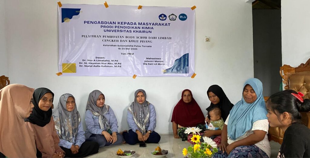Ternate – Tim Pengabdian kepada Masyarakat (PKM) dari Program Studi Pendidikan Kimia FKIP Universitas Khairun (Unkhair) melaksanakan kegiatan inovatif berupa pelatihan pembuatan body scrub dari limbah kulit pisang dan daun cengkeh di Kelurahan Sulamadaha, Kota Ternate.