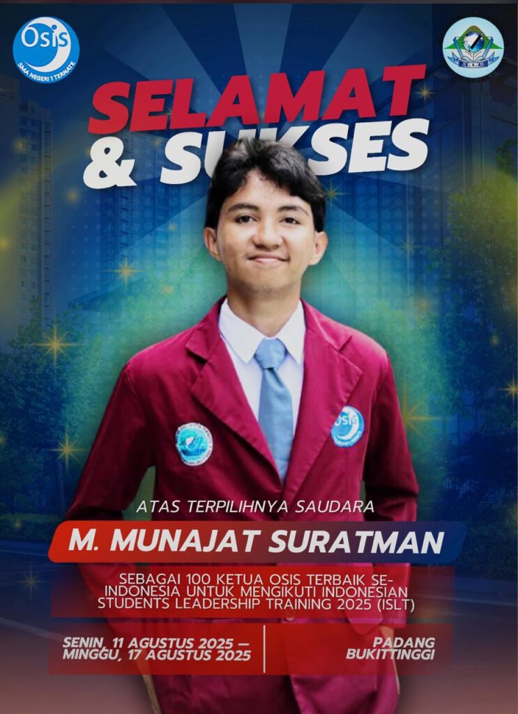 Ternate — Ketua OSIS SMA Negeri 1 Kota Ternate, M. Munajat Suratman, berhasil meraih prestasi membanggakan di tingkat nasional. Ia terpilih sebagai salah satu dari 100 Ketua OSIS terbaik se-Indonesia untuk mengikuti kegiatan Indonesian Students Leadership Training (ISLT) 2025 yang akan digelar di Bukit Tinggi, Sumatera Barat, pada 11-17 Agustus 2025.
