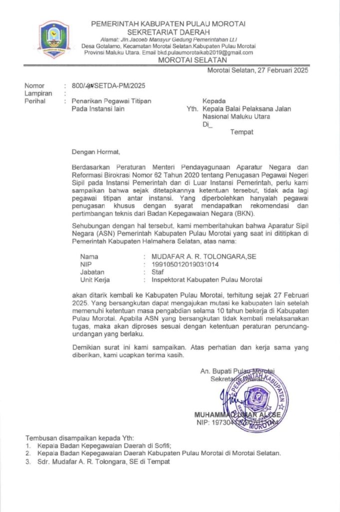 Surat penarikan pegawai titipan dari Pemkab Pulau Morotai